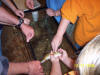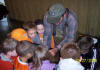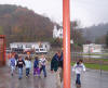 | For the sixth annual Coal Creek Health Day, it rained on us, but that didn't stop the students from taking on the rain for a quick visit to the creek to check out the cool beaver dam. Volunteers from the Coal Creek Watershed Foundation (CCWF), Clinch River Trout Unlimited (TU), and Tennessee Valley Authority (TVA) concentrated on teaching students how to study the health of Coal Creek that flows right beside their school. The lessons taught the kids how the health of the creek is determined by studying what lives in it. |