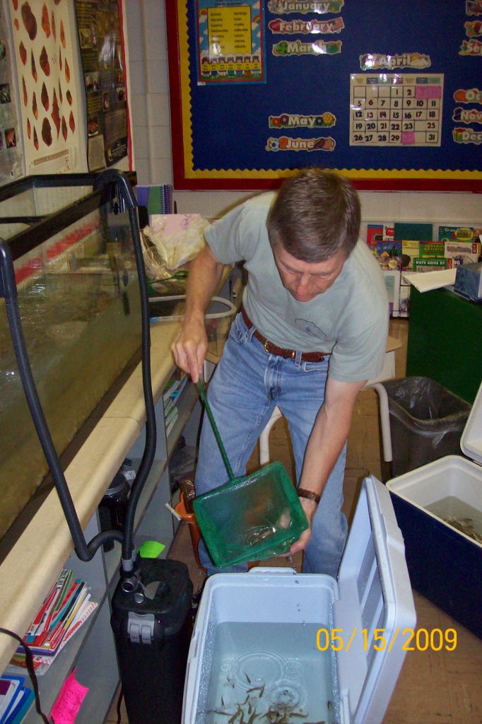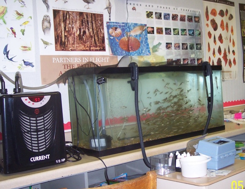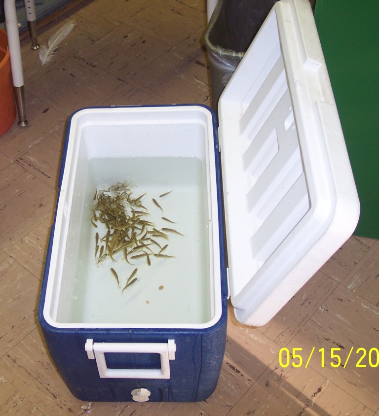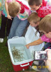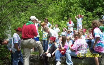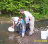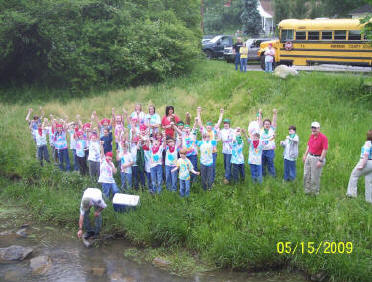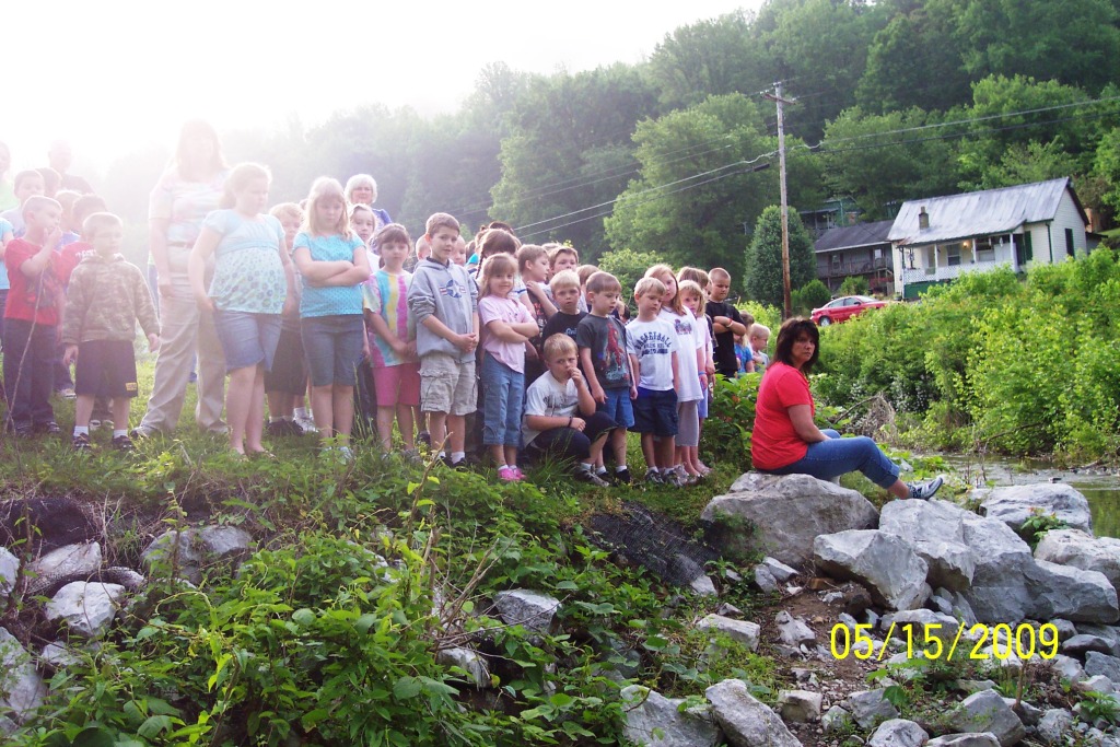 Students from the entire school participated in the release of the trout at the school, and the 4th and 5th grade classes released the trout at Joe Day Bridge and the Right Fork of Coal Creek. The temperature of Coal Creek today ranged from 60 to 62 degrees F at the locations tested, compared to a hatchery temperature of 55 degrees F. Within the next month or so, Coal Creek will warm to the point where the fry will need to migrate downstream to the Clinch River tailwater to survive. The Right Fork of Coal Creek is spring-fed, so water temperature there should remain within the survivable range for most, if not all, of the year. |