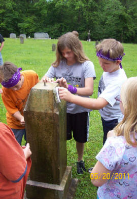 Briceville Church At Briceville Cemetery, students cut limbs and vegetation encroaching on the headstone of Eugene Ault who wrote a farewell message on a barricade wall before he suffocated in the Cross Mountain Mine. Students also made rubbings from his headstone. His farewell message says, “Dear Father, Mother, Brothers, and Sisters, I guess I come to die. Well I started out and come to the side track and Alonzo Wood is with me. Air is not much now. Well, all be good and I aim to pray to God to save me and all of you. Tell Clarence to wear out my clothes, give him my trunk. I guess I'll never be with you any more. So goodbye. Give them all my love. Give Bessie Robbins a stickpin of mine. Tell her goodbye.” |