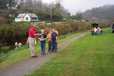 TVA volunteer Charlie Saylor and John Thurman, Dick Geiger, and Barry Thacker from the Clinch River Chapter of Trout Unlimited treated the kids to creek exploration between doctor and dental visits. Tables were set up at the creek to display fish and critters found in Coal Creek that flows by the school. They taught the kids how checking the health of the creek and checking their own health are related. |