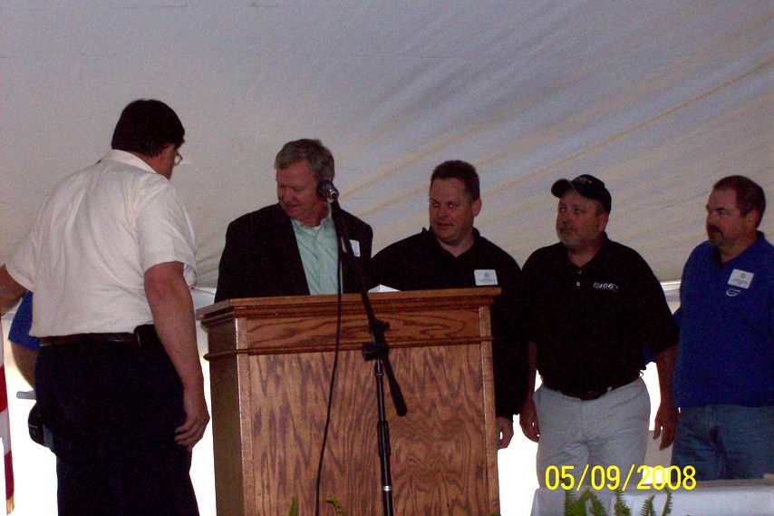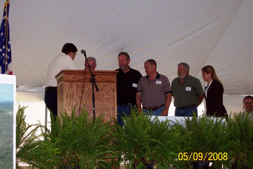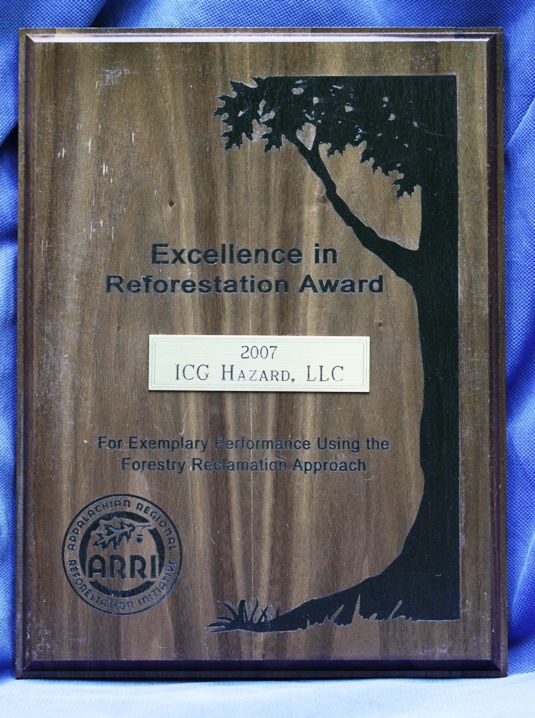 C. Stephen Allred from the Department of Interior, Hank List from the Kentucky EPPC, Joe Blackburn from the Office of Surface Mining, and Larry Arnett and Paul Rothman from the Kentucky DNR presented ICG with an Appalachian Regional Reforestation Initiative (ARRI) Award for its reforestation efforts at the Tip Top Mine. |