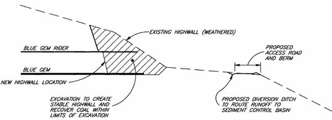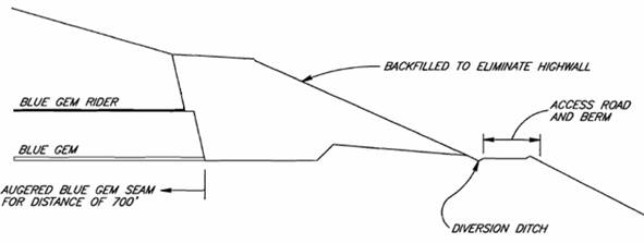 Whereas pre-SMCRA mining was done with little regard to the environment, modern mining is done with protection of the environment as an integral part of the process. Long before the start of mining, water and overburden sampling is performed to provide data for design of the mining plan. A sequence of activities is developed to control runoff and sediment throughout the mining and reclamation process after consultation with the U.S. Army Corps of Engineers, U.S. Fish and Wildlife, U.S. Natural Resources Conservation Service, Tennessee Wildlife Resources Agency, Tennessee Division of Natural Heritage, and Tennessee Historical Commission. These plans must be reviewed and approved by the U.S. Army Corps of Engineers, the U.S. Office of Surface Mining (OSM), and the Tennessee Department of Environment and Conservation (TDEC). At the Tackett Creek Surface Mine #2, planning and preparation of a mine permit application is performed by Mark V Mining and Engineering, Inc., working as a consultant to Kopper Glo Fuel. Re-mining at the site is done by both surface mining and highwall (auger) mining where coal is removed from beneath an exposed highwall without disturbing the land above it. Highwall mining can rarely be performed beneath a pre-SMCRA highwall due to safety concerns and space limitations. A rockfall from a ragged, pre-SMCRA highwall could damage highwall mining equipment and injure operators; thus, a second cut is required to expose a fresh, unweathered highwall prior to coal removal by highwall mining in accordance with safety standards of the U.S. Mine Safety and Health Administration. Also, highwall mining equipment typically requires a minimum 100-foot wide bench from which to operate. The sequence of re-mining and reclamation is illustrated in the following photographs and cross-sections for the Blue Gem and Blue Gem Rider seams. A similar sequence is also applicable for mining of the Coal Creek and Coal Creek Rider seams located approximately 350 feet in elevation below the Blue Gem seam. |