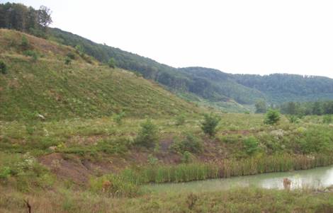 Kopper Glo Fuel uses the FRA method during reclamation. In 2009, OSM presented an ARRI Reforestation Award to Kopper Glo Fuel for its King Mountain Surface Mine in Claiborne County. Final reclamation of that mine site resulted in over 100,000 native hardwood trees being planted on 220 acres of reclaimed ground. The planting site for the Arbor Day 2011 event has been prepared according to the Forestry Reclamation Approach and can be accessed by school buses. Approximately half of the site has been backfilled to a gentle grade, with the remaining outslopes at a steeper grade above a sedimentation basin. |