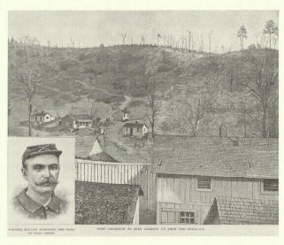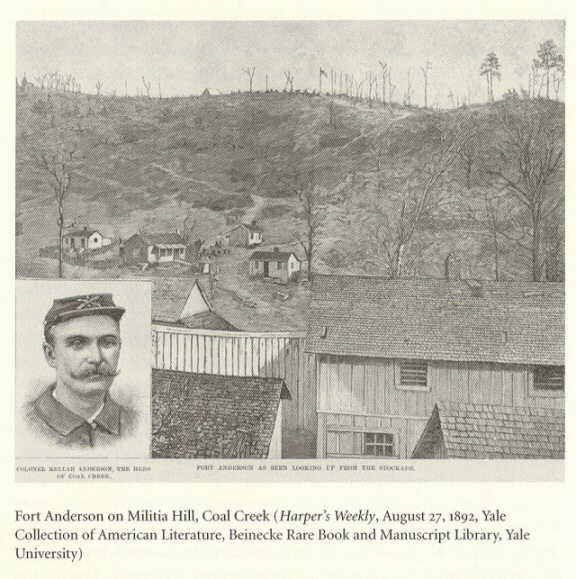 FIELD STUDY On March 29, 2006, Jacob, Cassie, and Jennifer explored the site around the abandoned KICC Mine and the hillside where the convict miners are buried. Sketches of the site, published by Harper’s Weekly magazine in 1892, were studied. They show the layout of the convict stockade and houses of the mine foremen, along with the proximity of Fort Anderson on Militia Hill on the ridge above the KICC Mine. The sketches also show that most of the trees from the KICC Mine up to Militia Hill had been cut during the war to reduce the chance of ambush by Coal Creek miners. |