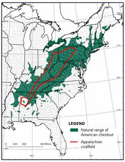 WHY SURFACE MINES? Reforestation experts and university researchers believe that surface mines will make excellent planting sites for re-introducing the American chestnut back into its native range for numerous reasons. The Appalachian coal fields are at the center of the chestnut’s native range. When the FRA is used, trees grow very fast, which means that they can reach reproductive maturity very quickly and their nuts can be carried into the surrounding forest by animals much sooner. The use of tree-compatible herbaceous cover means that there is much less competition interfering with chestnut seedlings compared to that found on old agricultural fields or clear-cut forests. Finally, scientists suspect that a root rot disease which kills chestnuts might be less aggressive in well-drained mine soils. |