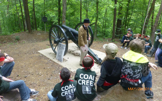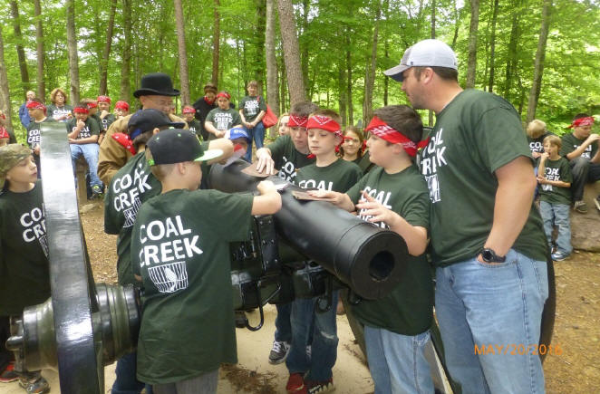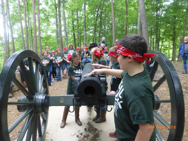 At Fort Anderson on Militia Hill, students got to see the breastworks dug around the fort where the Tennessee National Guard had its base of operations during the Coal Creek War. They also did a re-enactment of the siege on Fort Anderson with fourth graders portraying the miners and fifth graders portraying the soldiers. At the cannon atop Militia Hill, Thomas told how miners lost the final battle, but won the war to abolish convict leasing in Tennessee. |