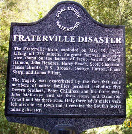 Life was good after Coal Creek miners fought the Tennessee National Guard to abolish the convict lease system in the Coal Creek War (1891 to 1892). Miners built new schools, churches, roads, and even an opera house. Disaster struck on 19 May 1902 when the Fraterville Mine exploded, killing all 216 miners. Twenty-six of the miners barricaded themselves in rooms of the mine and lived long enough to write farewell letters before suffocating. Only three adult males were left alive in the town of Fraterville and it remains the worst disaster in the history of mining in the South. |